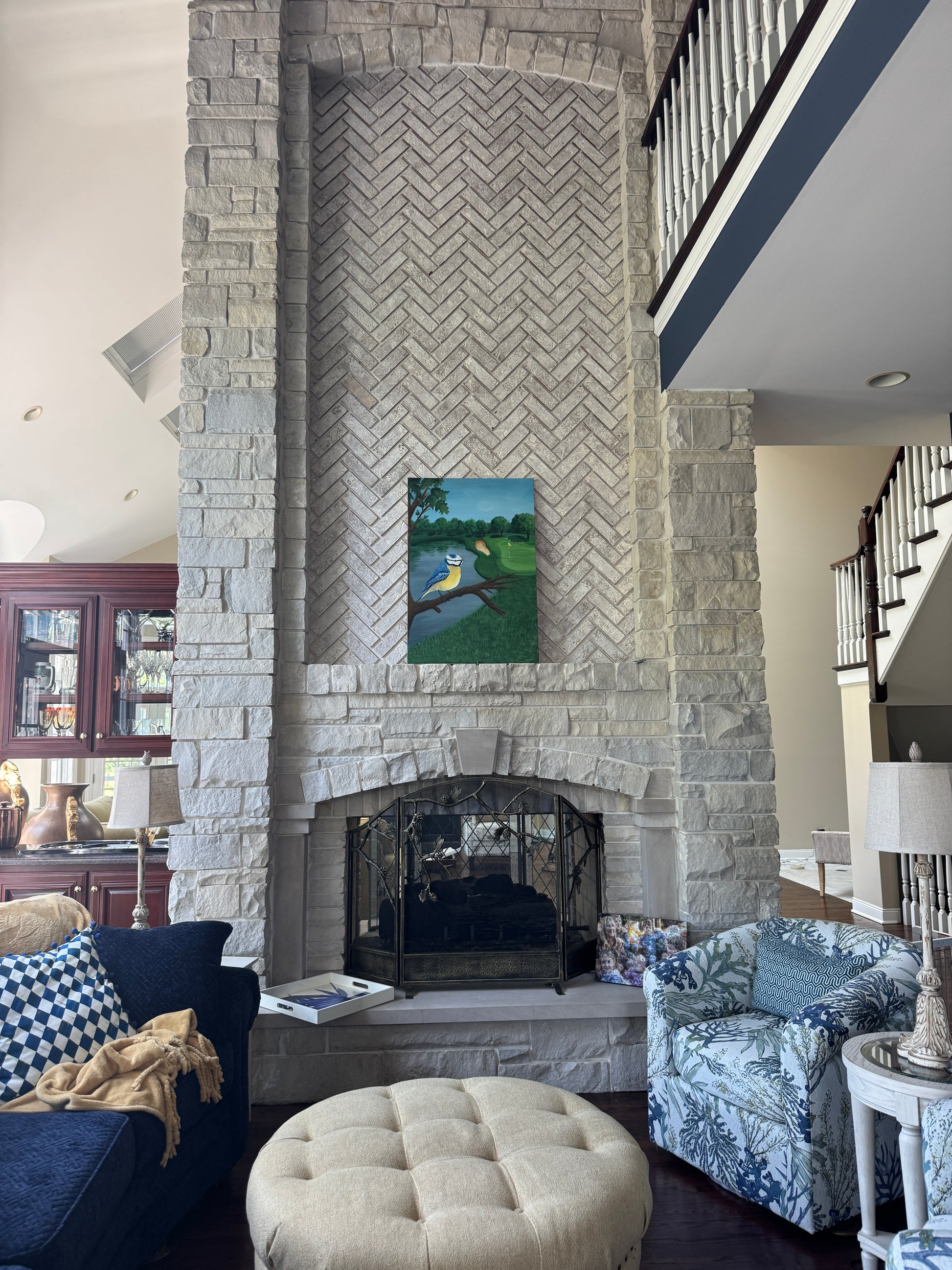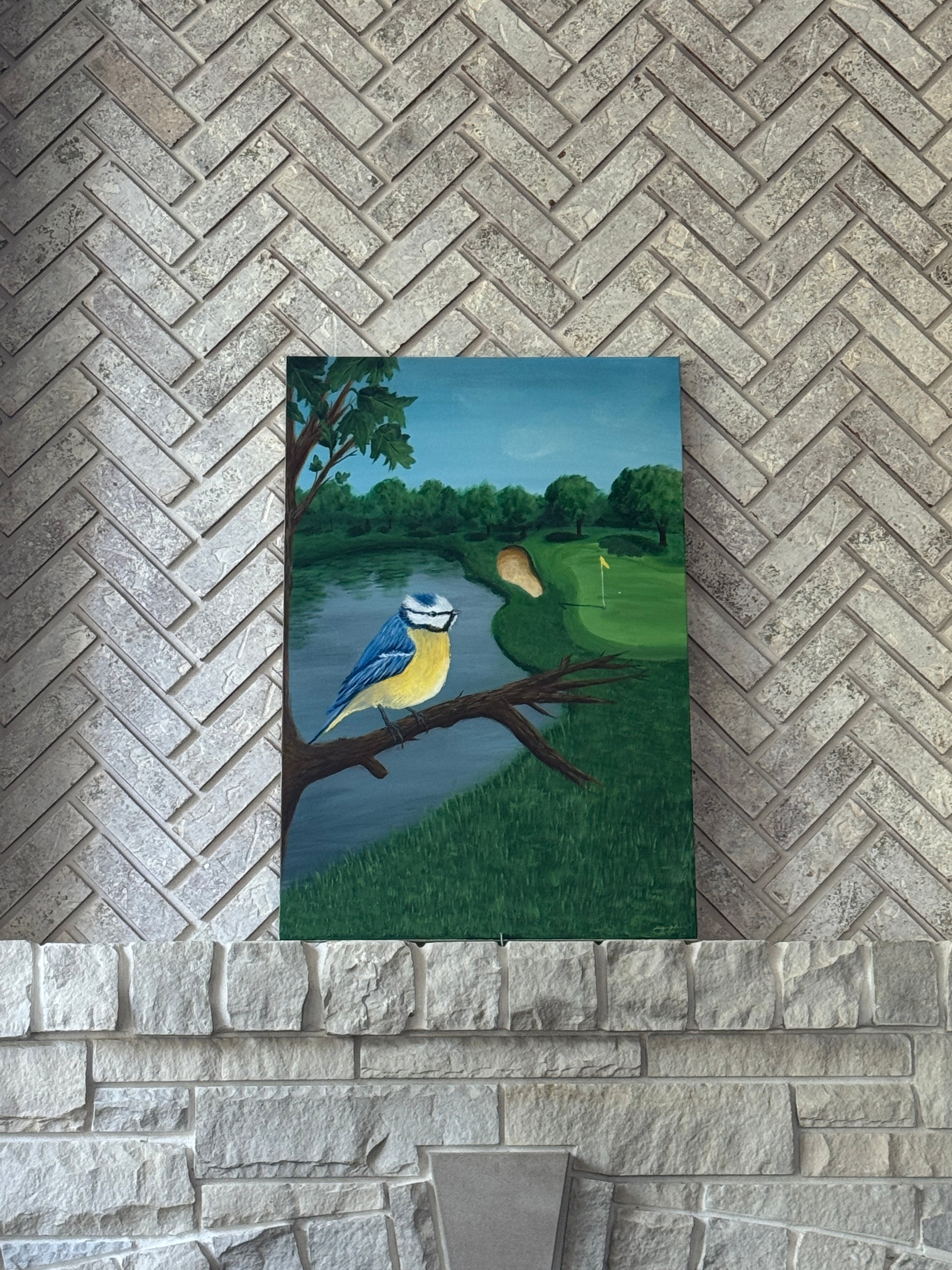 Eurasian Bluetit over a golf course. Acrylic on canvas. 24"x36". Original art.
